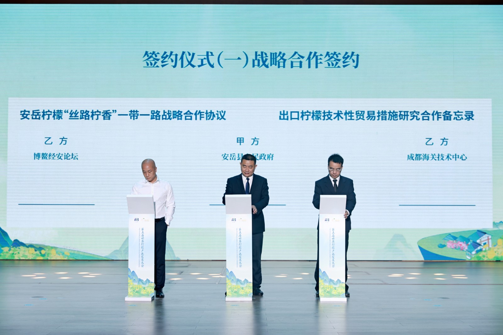 安岳县委书记刘建华对安岳柠檬产业作推介。他说,当前,安岳柠檬正从“川果”金字招牌向全球知名品牌蝶变。安岳将坚持“特色鲜明、质量优异”原则,大力实施建设一批标准化示范基地、培育一批现代化龙头企业、构建一张全球化营销网络、完善一套全环节创新体系、培育一批融合化新兴载体“五个一”工程,全力打造全球知名柠檬产品生产加工新高地,不断提升柠檬文化影响力、旅游竞争力和增收带动力。