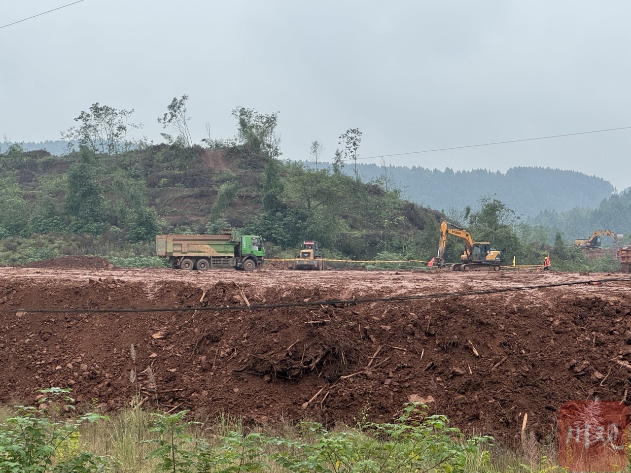 施工现场,脚下新推的黄土有些潮湿,不远处,渣土车与挖掘机组队,正围着一处山包作业。像这样需要被移平的山头,放眼望去起码还有四五处。