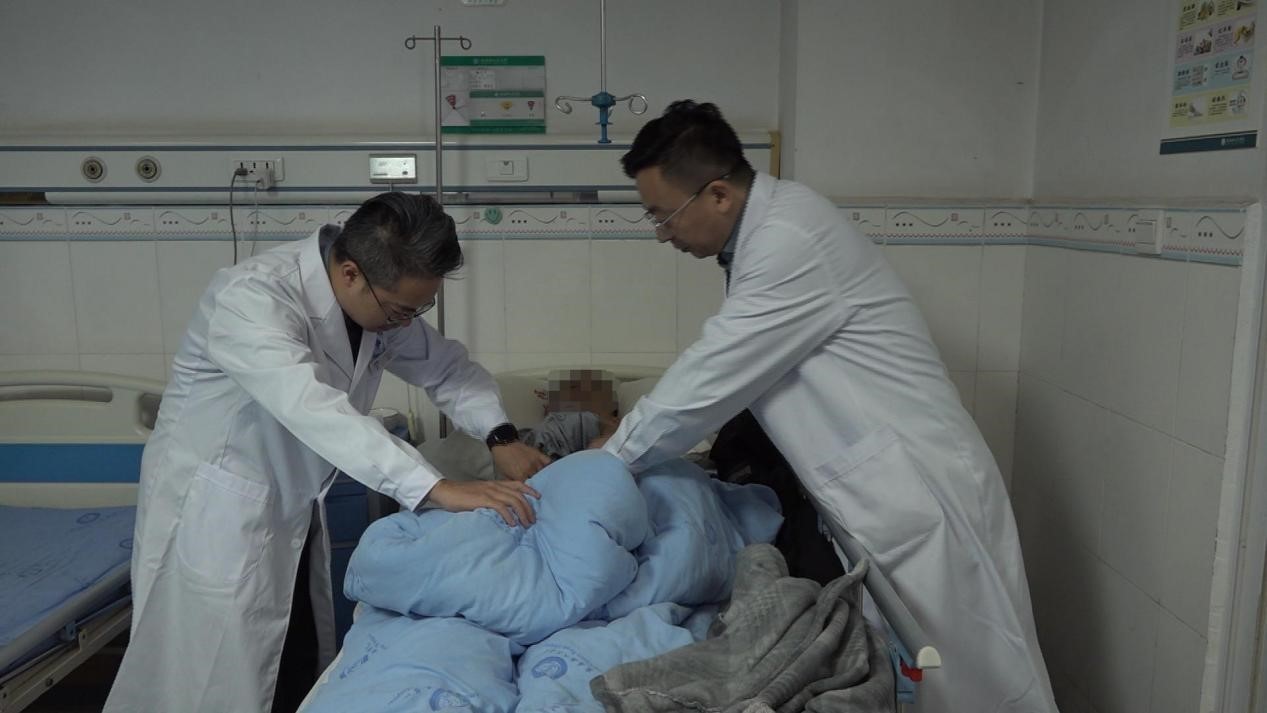 彭伟(左一)与人民医院医师对术后患者康复情况进行观察。唐险峰 摄