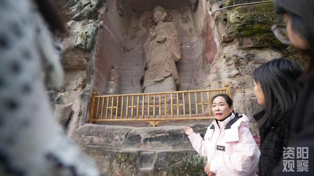安岳石刻点多面广、规模不一,讲解需在学术严谨与表达生动间找到最佳平衡。周春擅长以细节激活历史:讲解圆觉洞造像时,她会联系“天花乱坠”的成语典故,解释其身后雕刻的花蕊为何向下;揭秘卧佛院数十万字石刻经文中出现的“现代简化字”,实为古代草书演变而来……游客常感叹:“原来每个细节都藏着故事!”