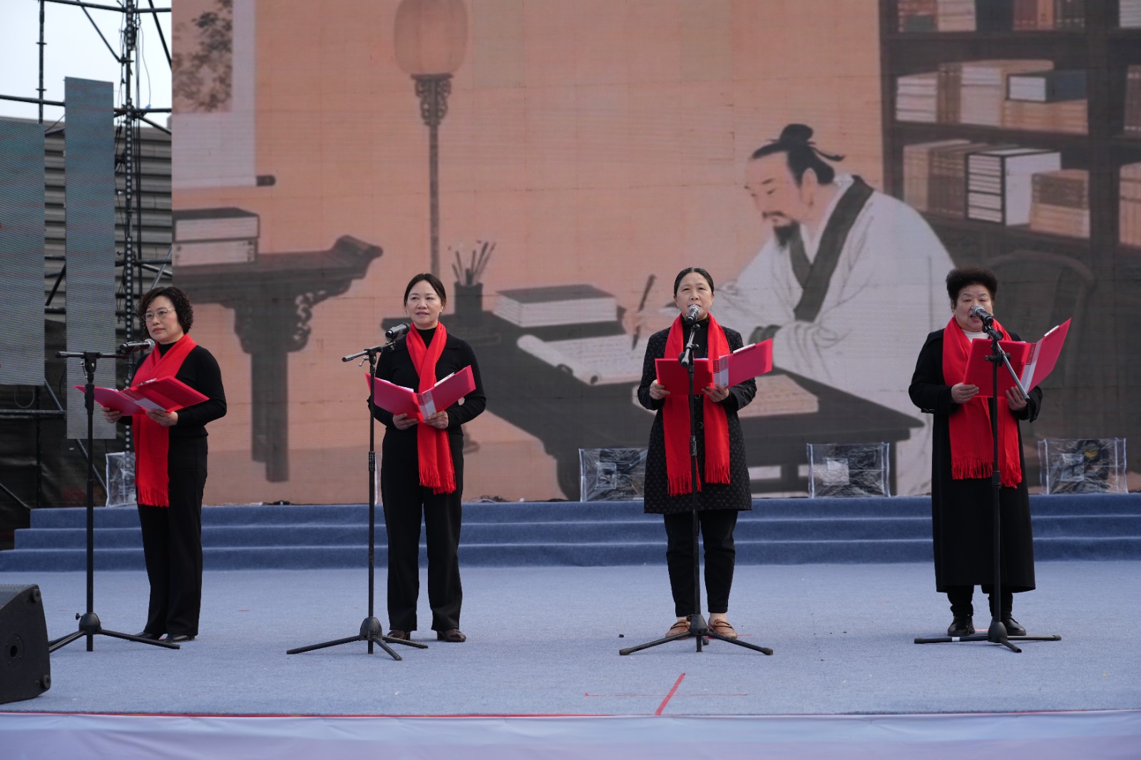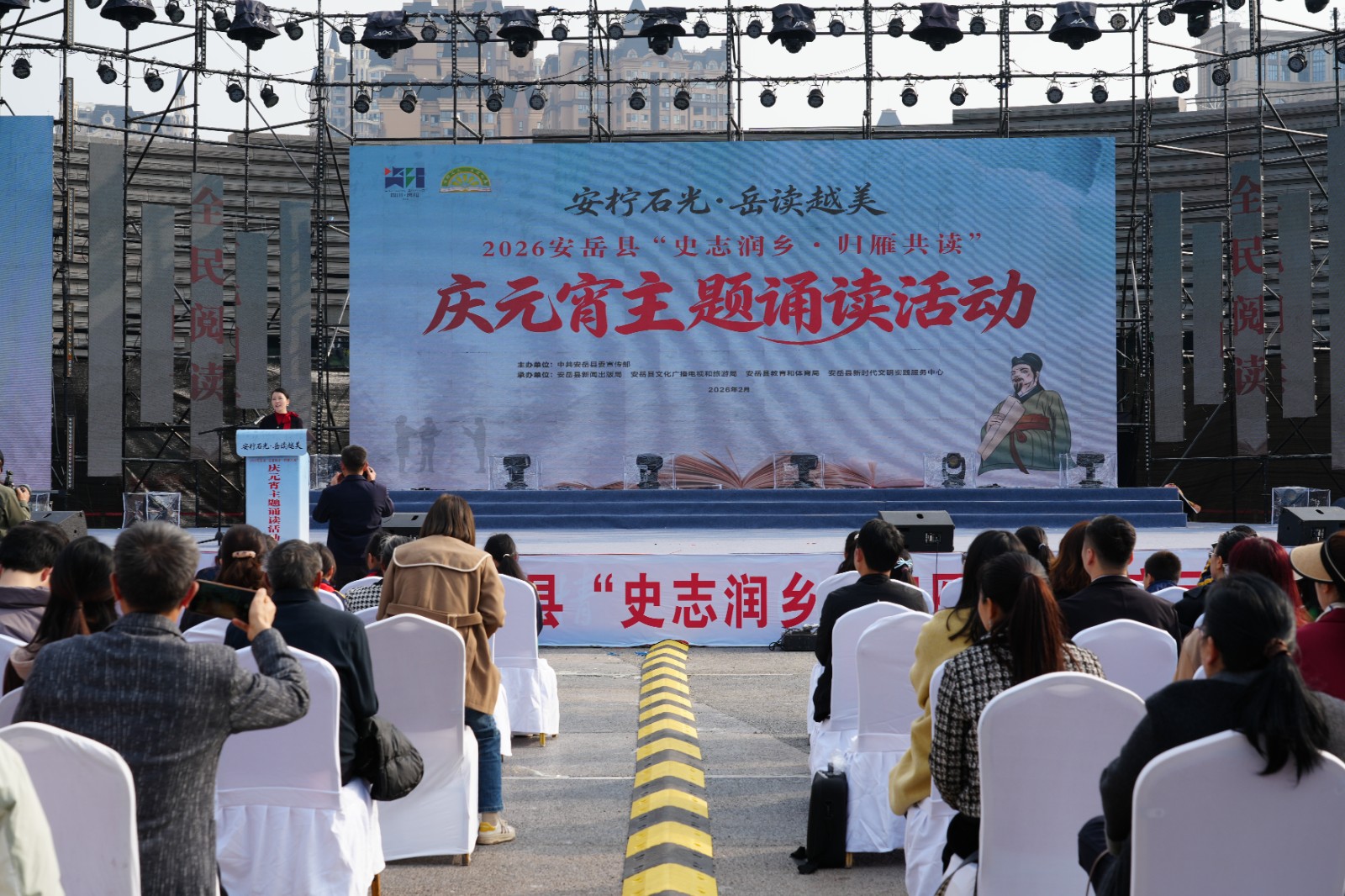舞台上,九韶小学孩子们带来情景朗诵《算章少年志》,朝气蓬勃;返乡大学生代表诵读《柠乡迎元宵,书香筑安岳》,青春洋溢;返乡企业家代表捧起《文脉安岳》诵读经典篇章,意气风发。本土歌曲《安岳故事长》的悠扬旋律中,书法家挥毫写下本次活动主题词,墨香与书香交融。最后的猜灯谜环节,谜面紧扣安岳史志、石刻文化与元宵习俗,让观众在趣味中感受优秀传统文化的魅力。