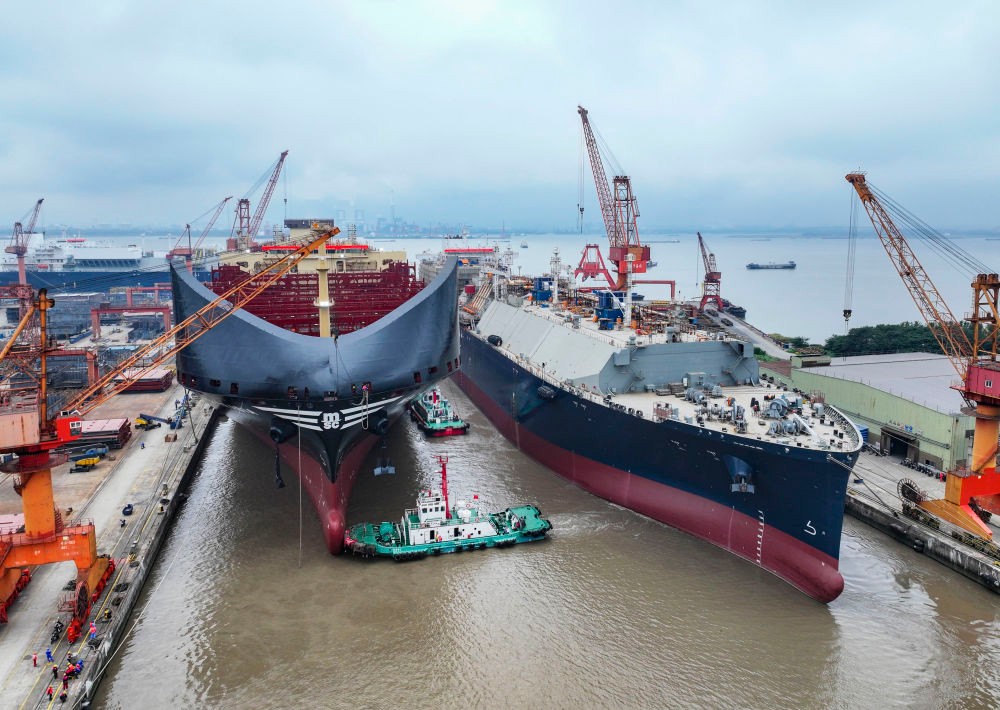 位于江苏省泰兴市的江苏扬子鑫福造船有限公司船坞内建造的大型船舶(无人机照片,2025年10月14日摄)。新华社发(顾继红 摄)