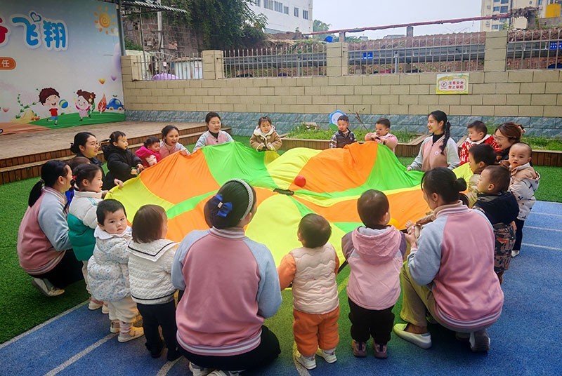 当日下午,在安岳县妇幼保健院托育中心。在小操场上,老师们正同孩子们做游戏,时不时传来阵阵笑声。孩子们天真烂漫的笑容格外暖人,他们在老师的引导下,或追逐嬉戏,或围坐一团参与互动小游戏,现场温馨而快乐。