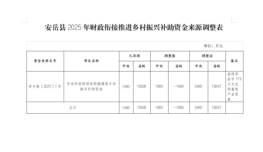 根据《四川省财政厅关于下达2025年中央和省级财政衔接推进乡村振兴补助资金预算的通知》(川财农〔2025〕28号)和《安岳县财政局关于下达2025年中央和省级财政衔接推进乡村振兴补助资金预算的通知》(安财农〔2025〕290号)精神,调整2025年第一批中省财政衔接推进乡村振兴补助资金来源,调整资金总量不变,现将资金调整情况予以公告。