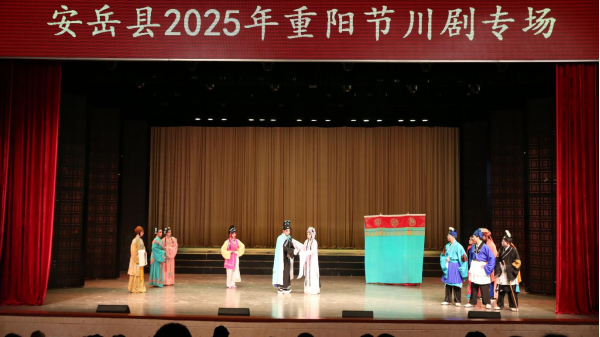 为弘扬中华优秀传统文化,充分展示川剧这一国家级非物质文化遗产的独特艺术魅力,丰富群众精神文化生活,10月25日,安岳县2025年重阳节川剧专场演出在县演艺中心成功举办,以此向老年群体致以节日的问候与美好祝福。