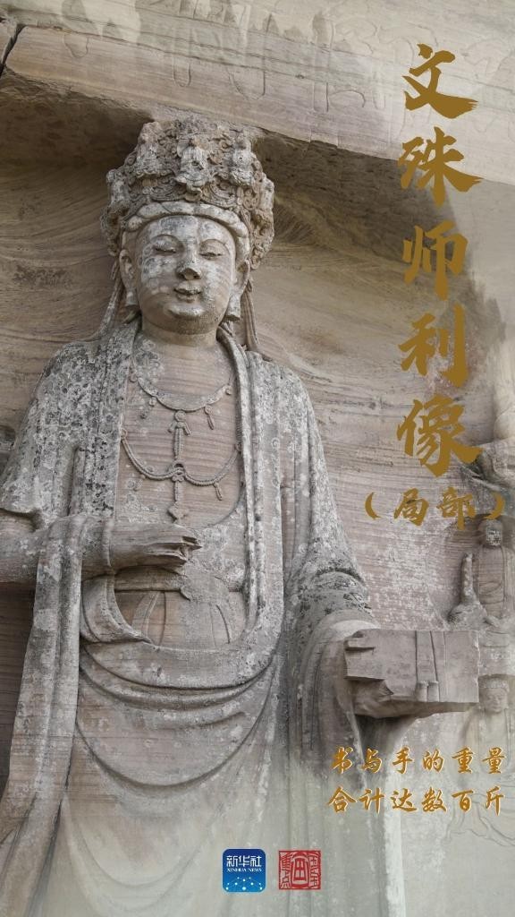 文殊师利像高6.4米,左手托书向外伸展1.5米,书与手的重量合计达数百斤,仅由高2.2米的垂地袈裟支撑,历经千年不倒。这一设计是古代匠师巧妙运用力学的杰作,展现了中国古代雕塑艺术与科学技术的完美结合。